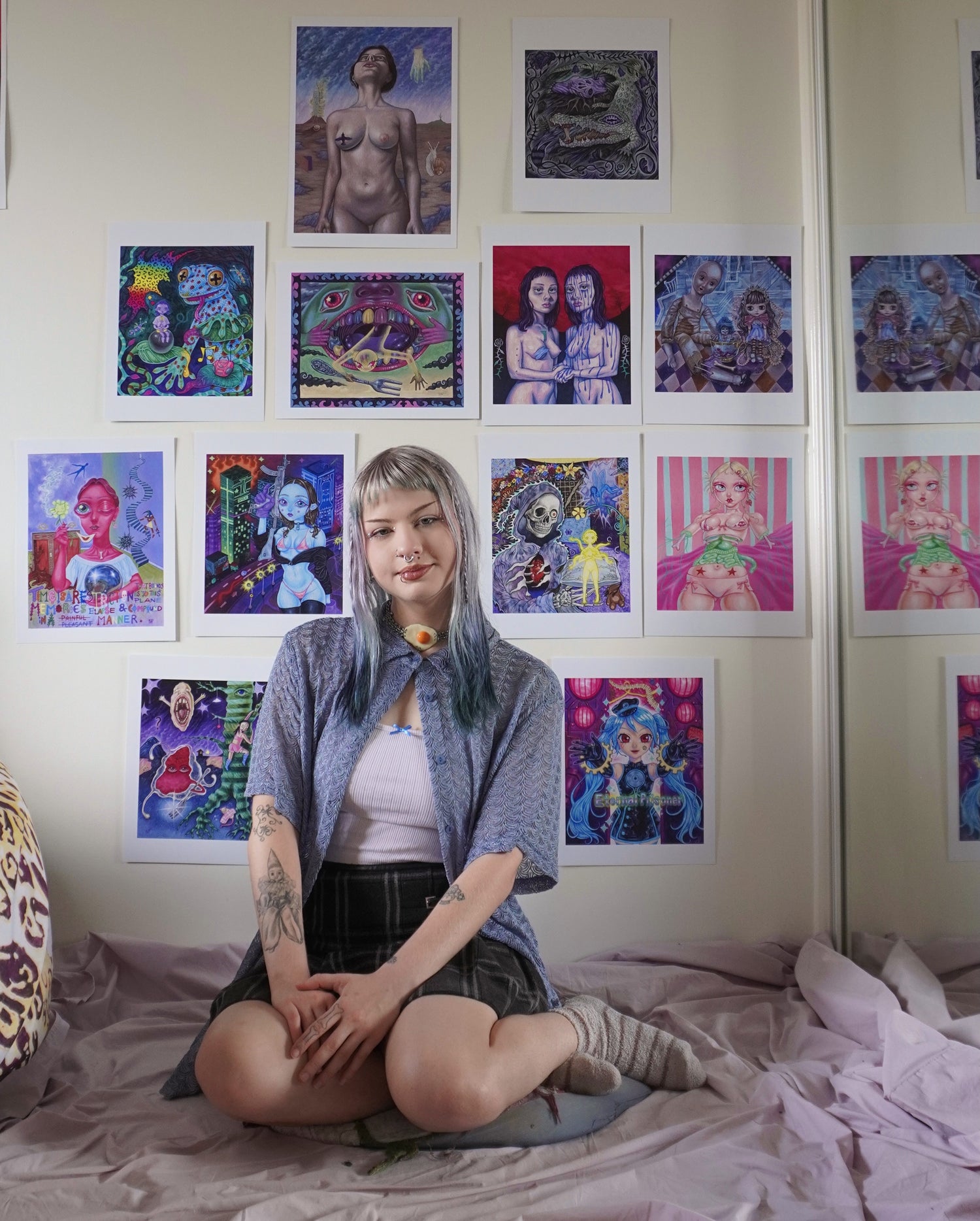 My name is Emma Pattemore, also going by Butturbum, I am an independent Artist born in 2003 from North Queensland Australia. Pursuing Art professionally has been my ultimate dream since I was 12 and I have been drawing ever since I was 2 years old. As a person living with ASD, PTSD, ADD, BPD and anxiety and depression I’ve combined my experiences and thoughts within my art practice to create my own unique style of surrealist acrylic paintings that aims to uplift, connect and motivate the viewer to face the strange and confusing parts within themselves.