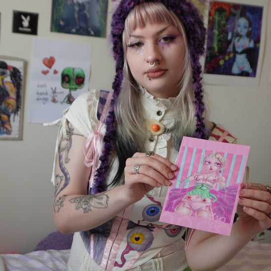 My limited edition specialty prints are here, and not forever. Only available in size 5 x 7" on thick 350gsm glossy paper. High quality and colour matched to the original artwork, including a hand written Artist statement printed on the back of each print, as well as individually hand signed with love on the front. These are designed to be a collectible special edition item, after they sell out I will not be printing them again! These cards come in metallic and holographic finishings, I hope you enjoy them as much as I do.