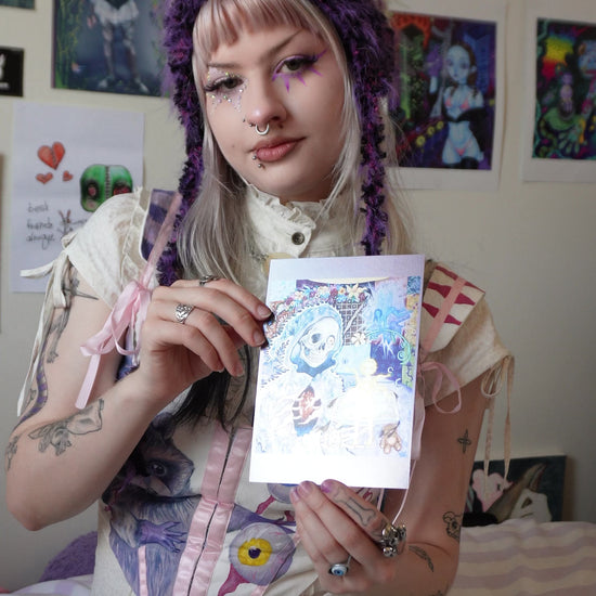My limited edition specialty prints are here, and not forever. Only available in size 5 x 7" on thick 350gsm glossy paper. High quality and colour matched to the original artwork, including a hand written Artist statement printed on the back of each print, as well as individually hand signed with love on the front. These are designed to be a collectible special edition item, after they sell out I will not be printing them again! These cards come in metallic and holographic finishings, I hope you enjoy them as much as I do.