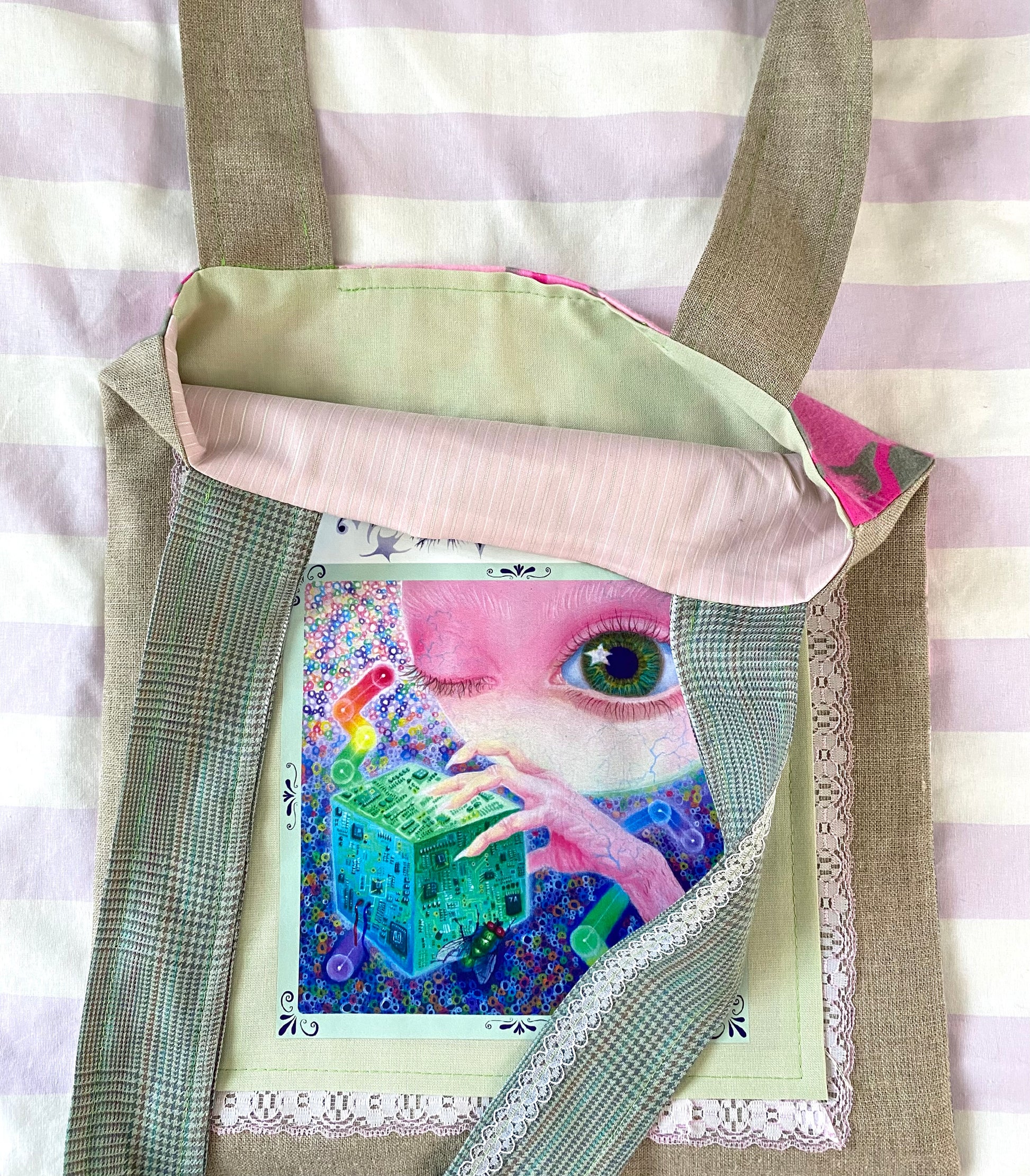 Introducing………..The new never been done before Butturbum handmade Tote bag. Each bag is unique, 1 of 1, and STRICTLY made out of only secondhand and salvaged fabric and materials, including the lace, doilies and thread used to sew it together. Each bag is fully lined as well for high quality feel and usage, because I care about that. Each bag is handmade solely by myself, the artist behind Butturbum, Emma, so this is one of my most personal products I have to offer yet besides my original Artworks. Each Bag will come with a free item, and a Tag with care and washing instructions. I hope if you purchase one of these you love it as much as I do, be sure to send me photos!