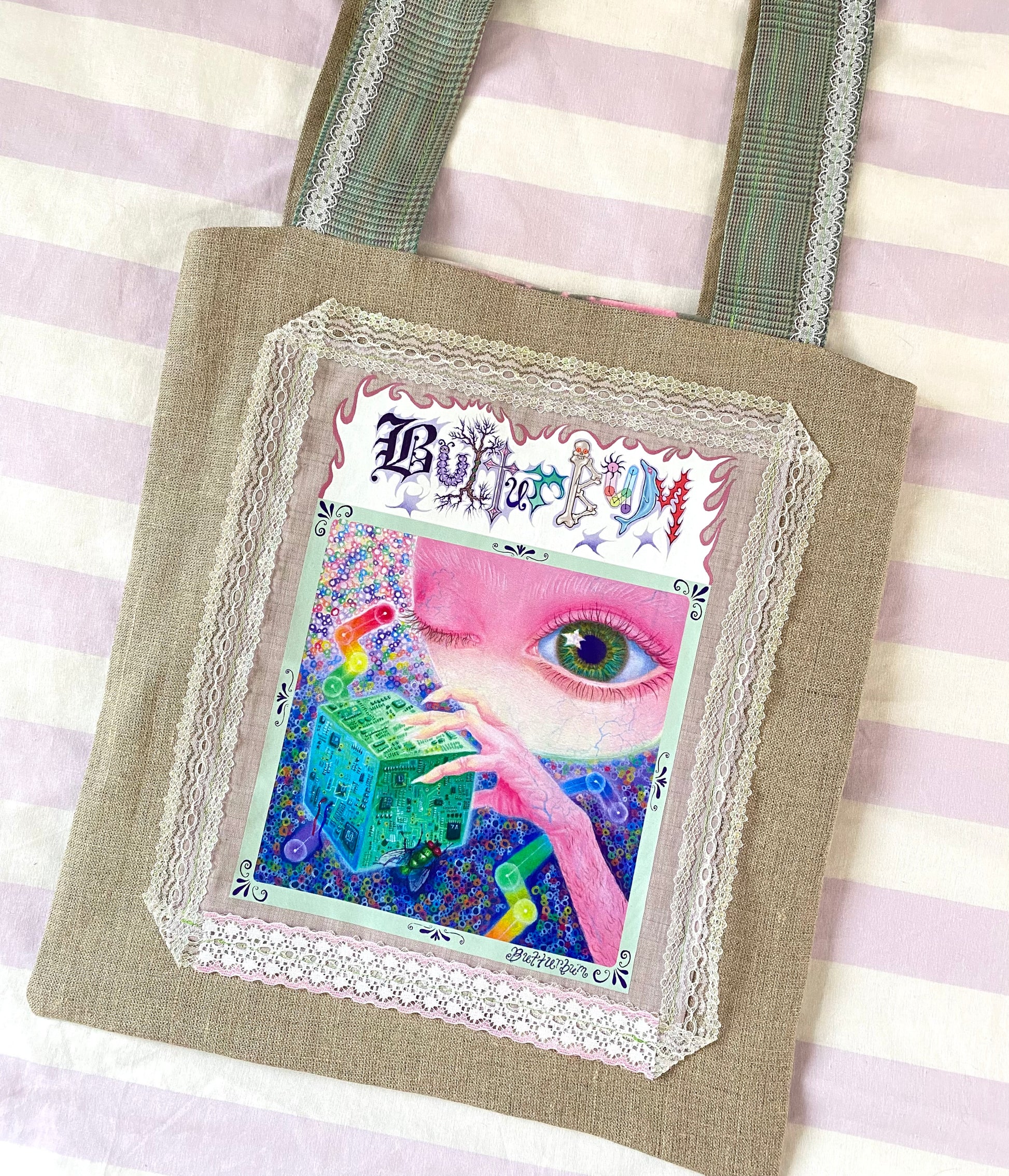 Introducing………..The new never been done before Butturbum handmade Tote bag. Each bag is unique, 1 of 1, and STRICTLY made out of only secondhand and salvaged fabric and materials, including the lace, doilies and thread used to sew it together. Each bag is fully lined as well for high quality feel and usage, because I care about that. Each bag is handmade solely by myself, the artist behind Butturbum, Emma, so this is one of my most personal products I have to offer yet besides my original Artworks. Each Bag will come with a free item, and a Tag with care and washing instructions. I hope if you purchase one of these you love it as much as I do, be sure to send me photos!