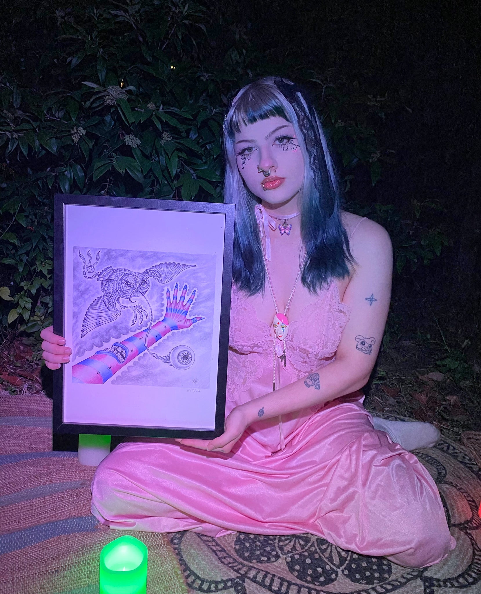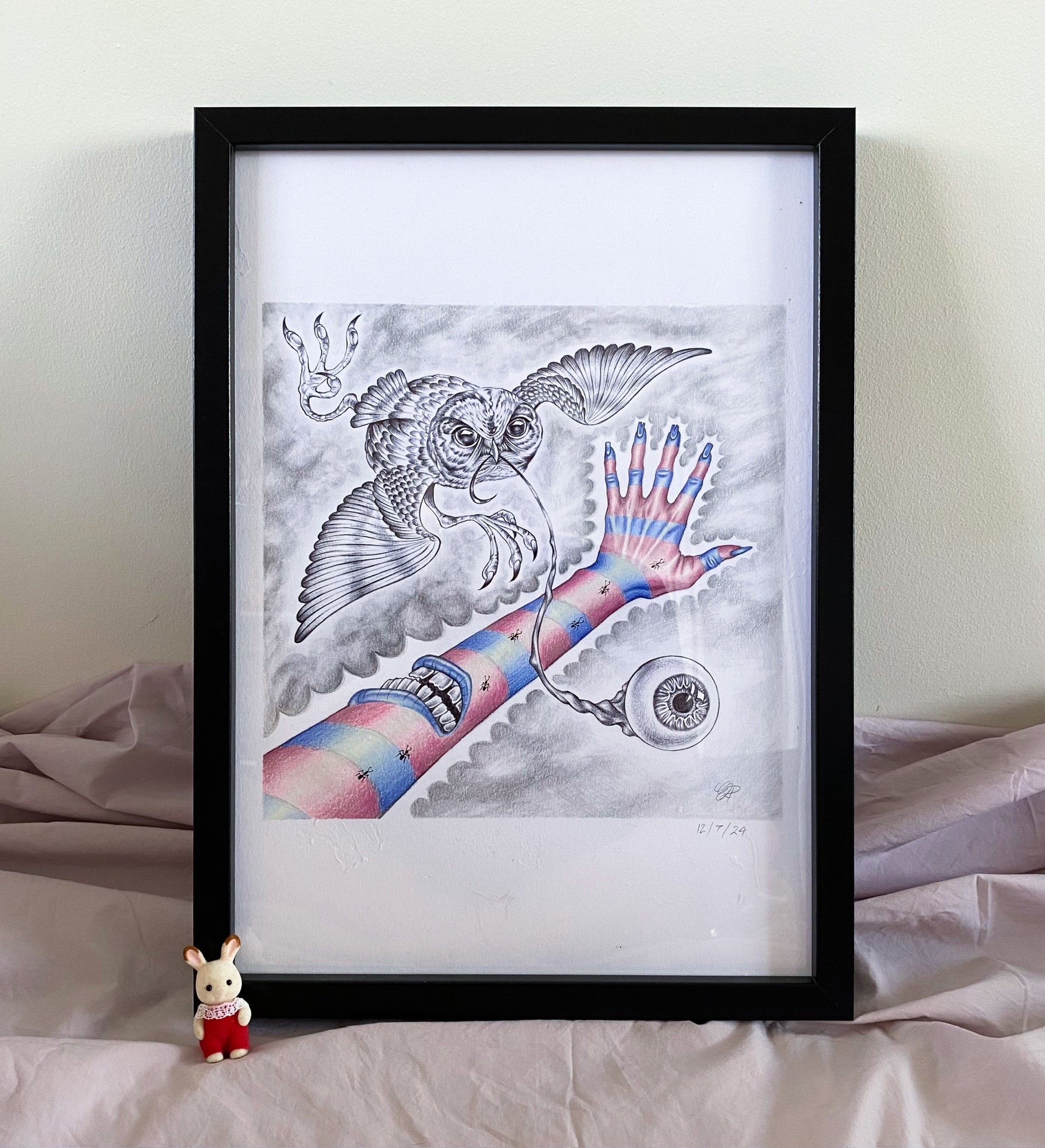 A3 original pencil and ballpoint pen illustration. This illustration will ward off any owls from stealing your eyeball.