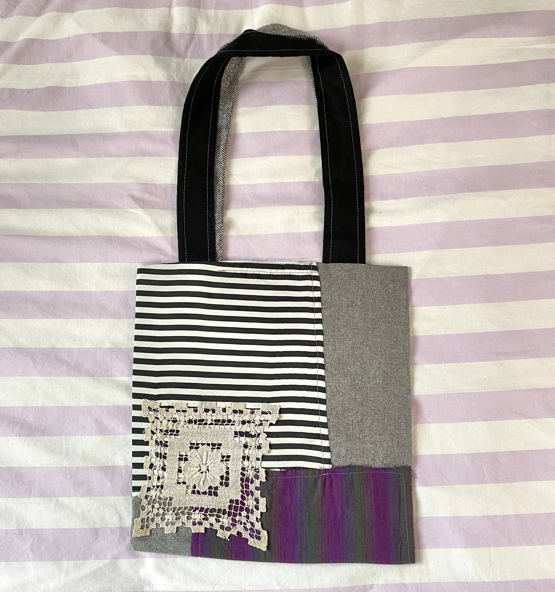 Introducing………..The new never been done before Butturbum handmade Tote bag. Each bag is unique, 1 of 1, and STRICTLY made out of only secondhand and salvaged fabric and materials, including the lace, doilies and thread used to sew it together. Each bag is fully lined as well for high quality feel and usage, because I care about that. Each bag is handmade solely by myself, the artist behind Butturbum, Emma, so this is one of my most personal products I have to offer yet besides my original Artworks. Each Bag will come with a free item, and a Tag with care and washing instructions. I hope if you purchase one of these you love it as much as I do, be sure to send me photos!