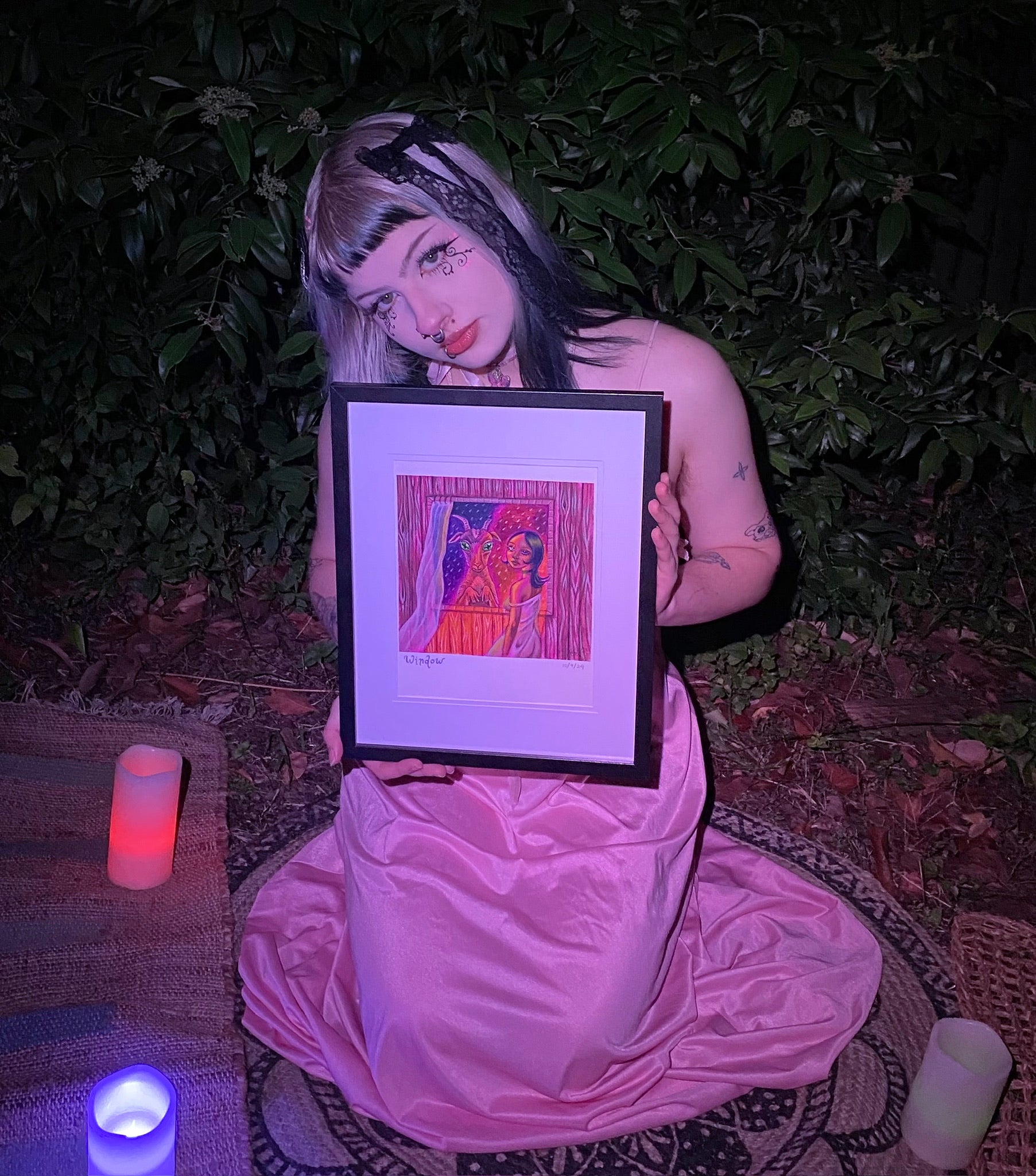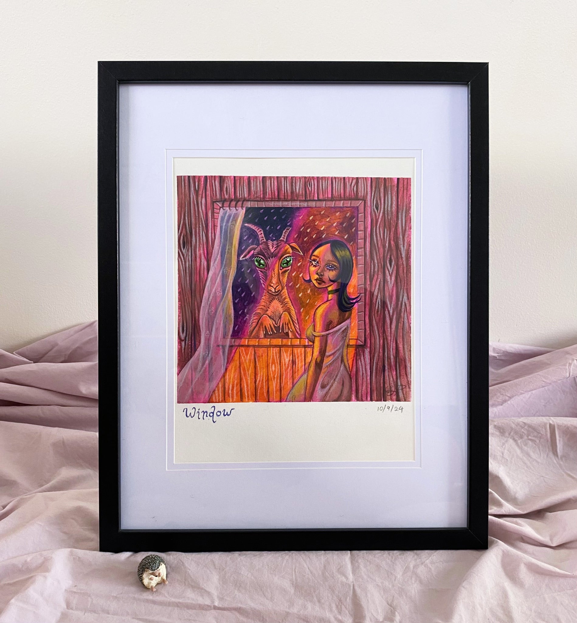 8 x 10" original acrylic painting within 8 x 10” frame. Who watches you through your window at night? May as well make friends with them.